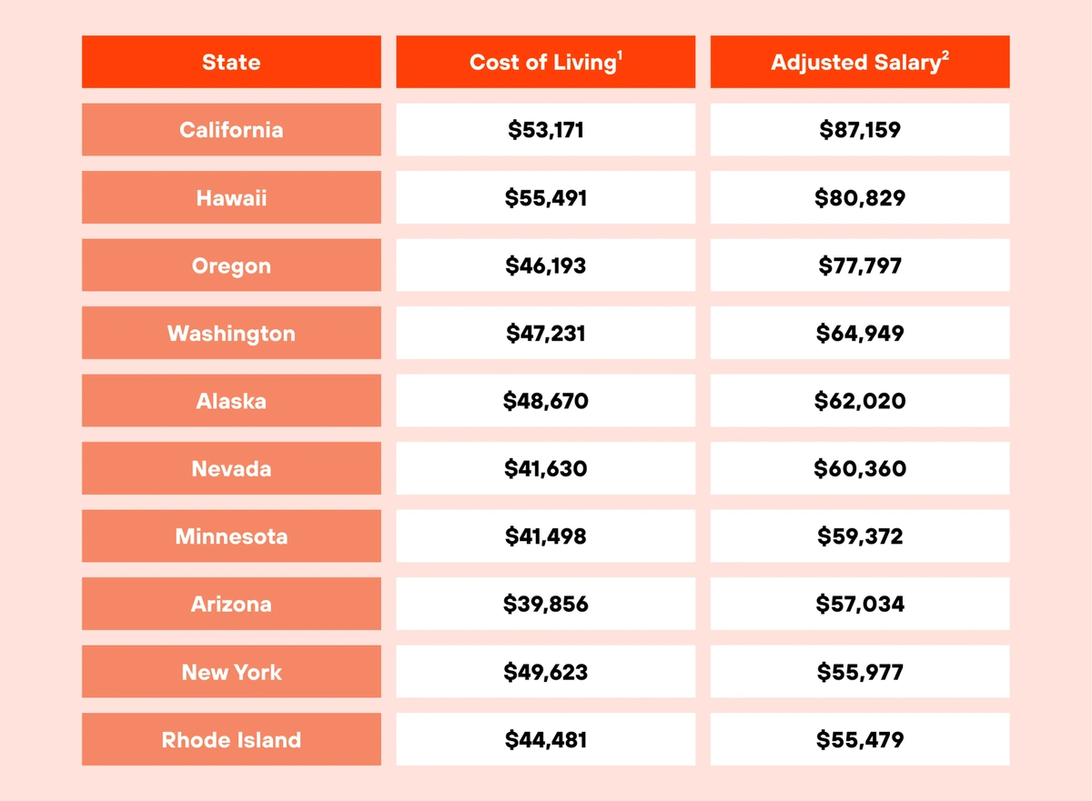 - California still took the top spot with the highest adjusted salary of $87,159.
